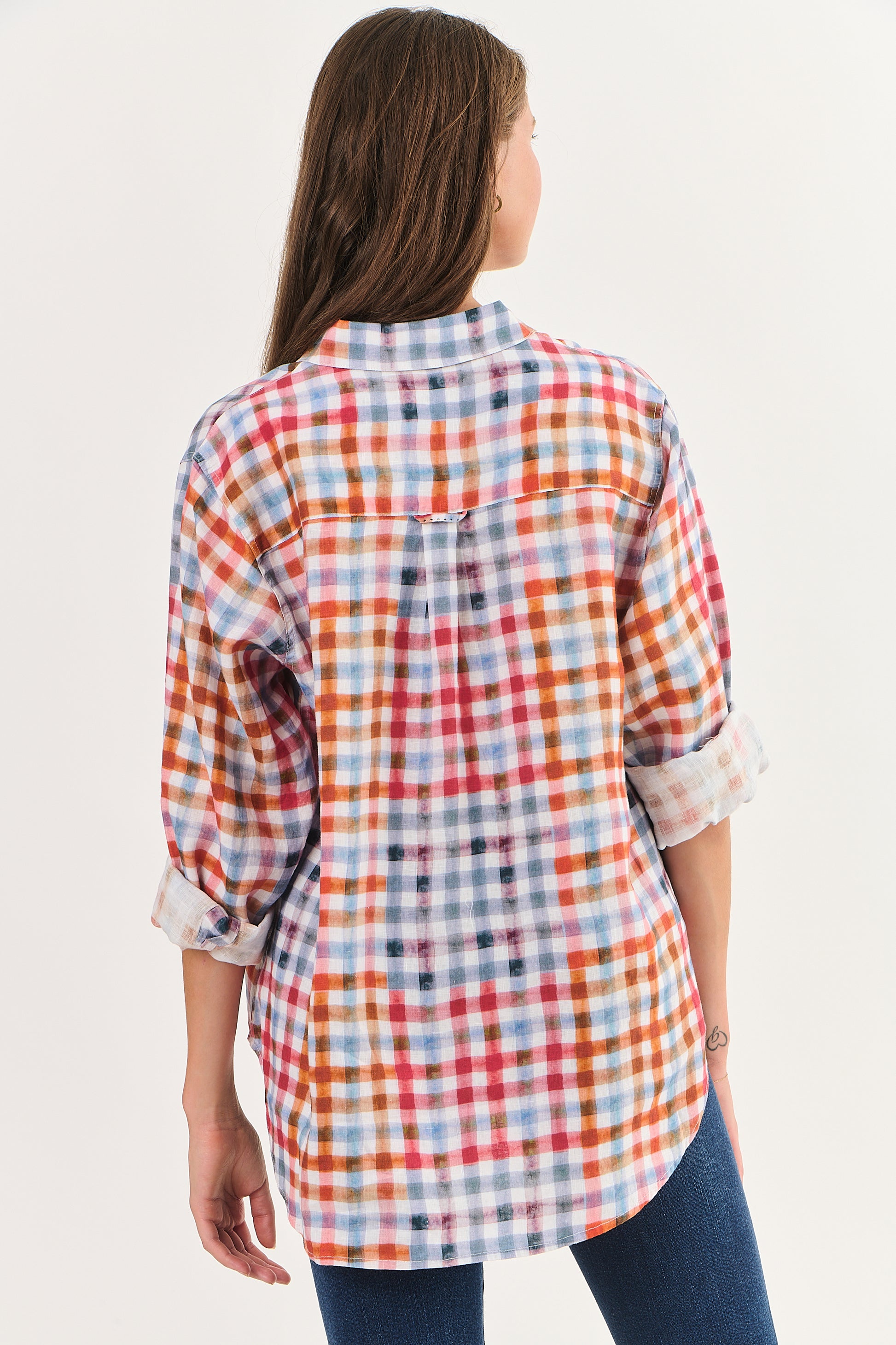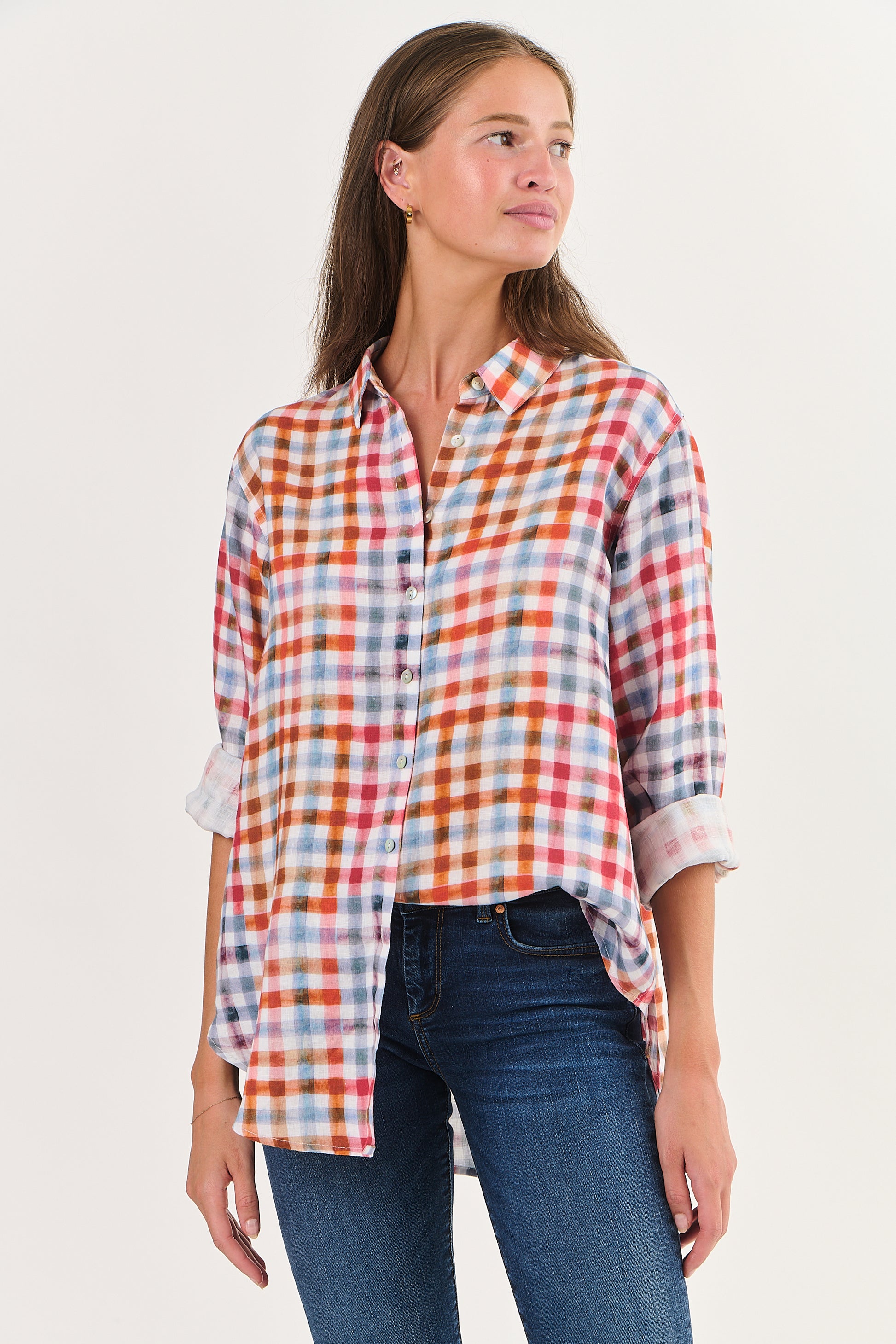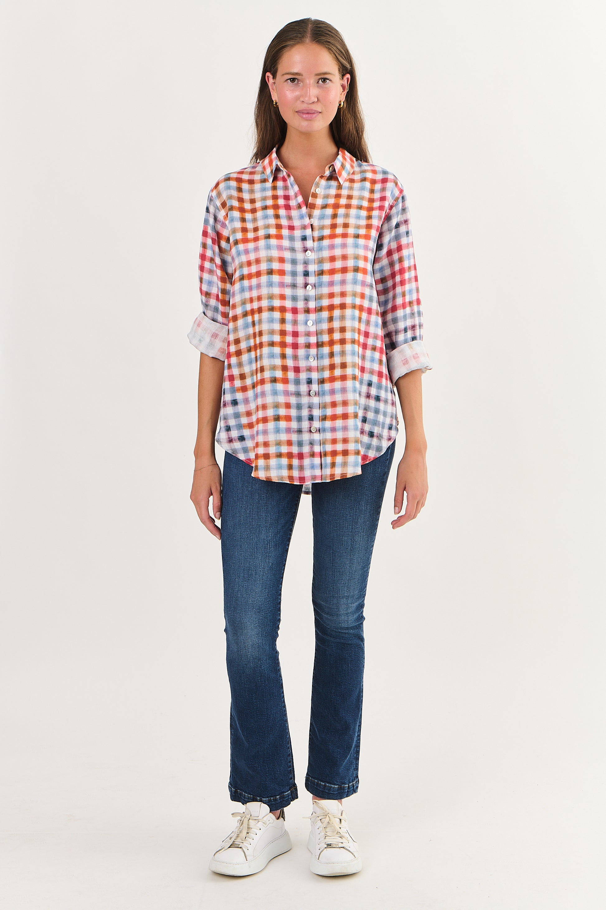 Agadir, a Moroccan city with turquoise waters and an iconic promenade. Our signature boyfriend shirt in the eye-catching Agadir check print is crafted in super soft, laundered linen with a relaxed shape, long sleeve, button through, and collar. You will notice the signature stitch detail and lush finish offered by this gorgeous label.