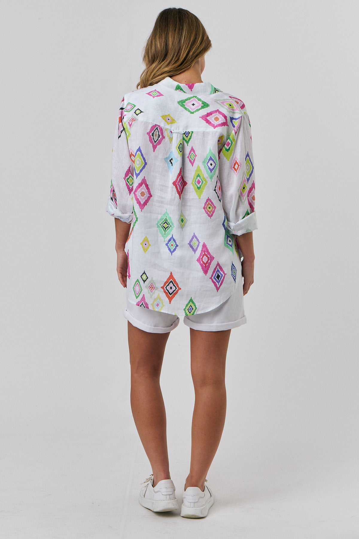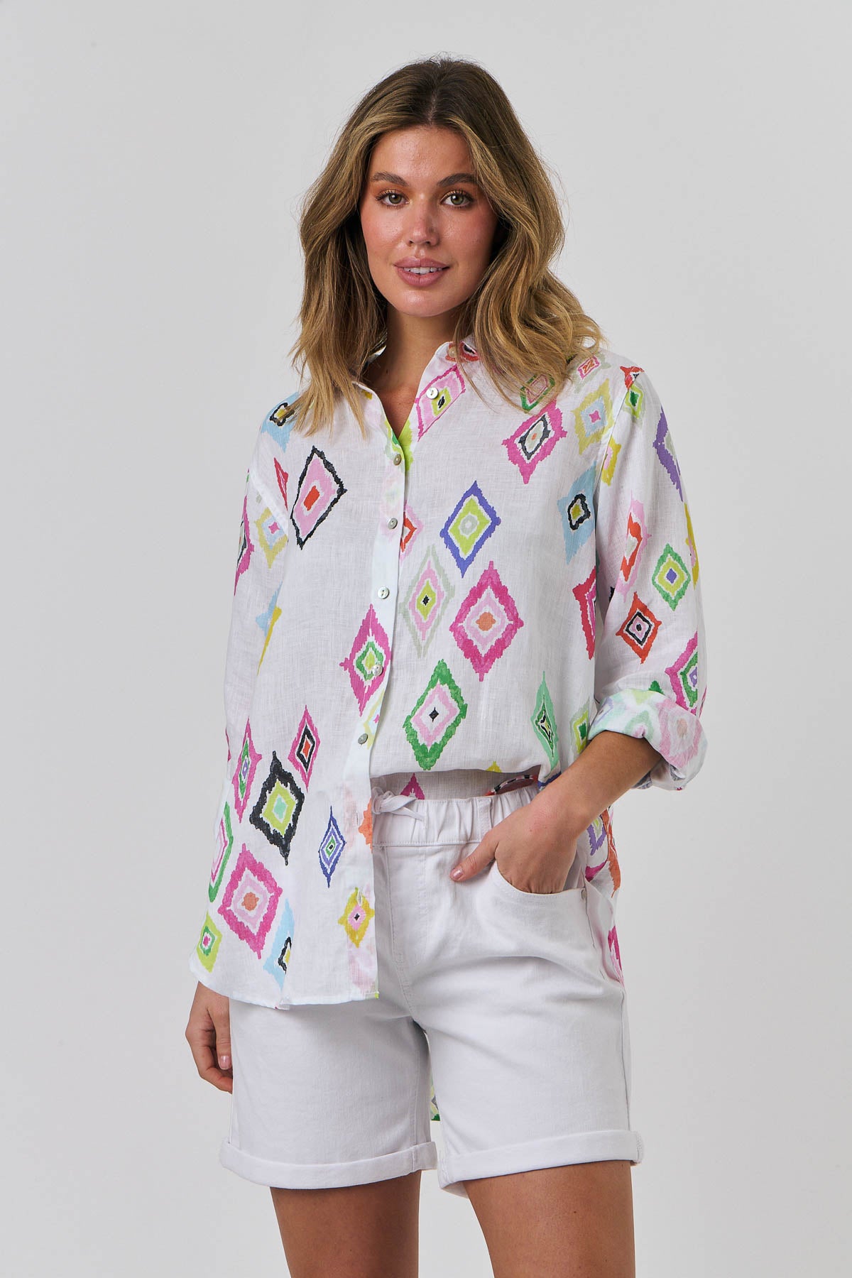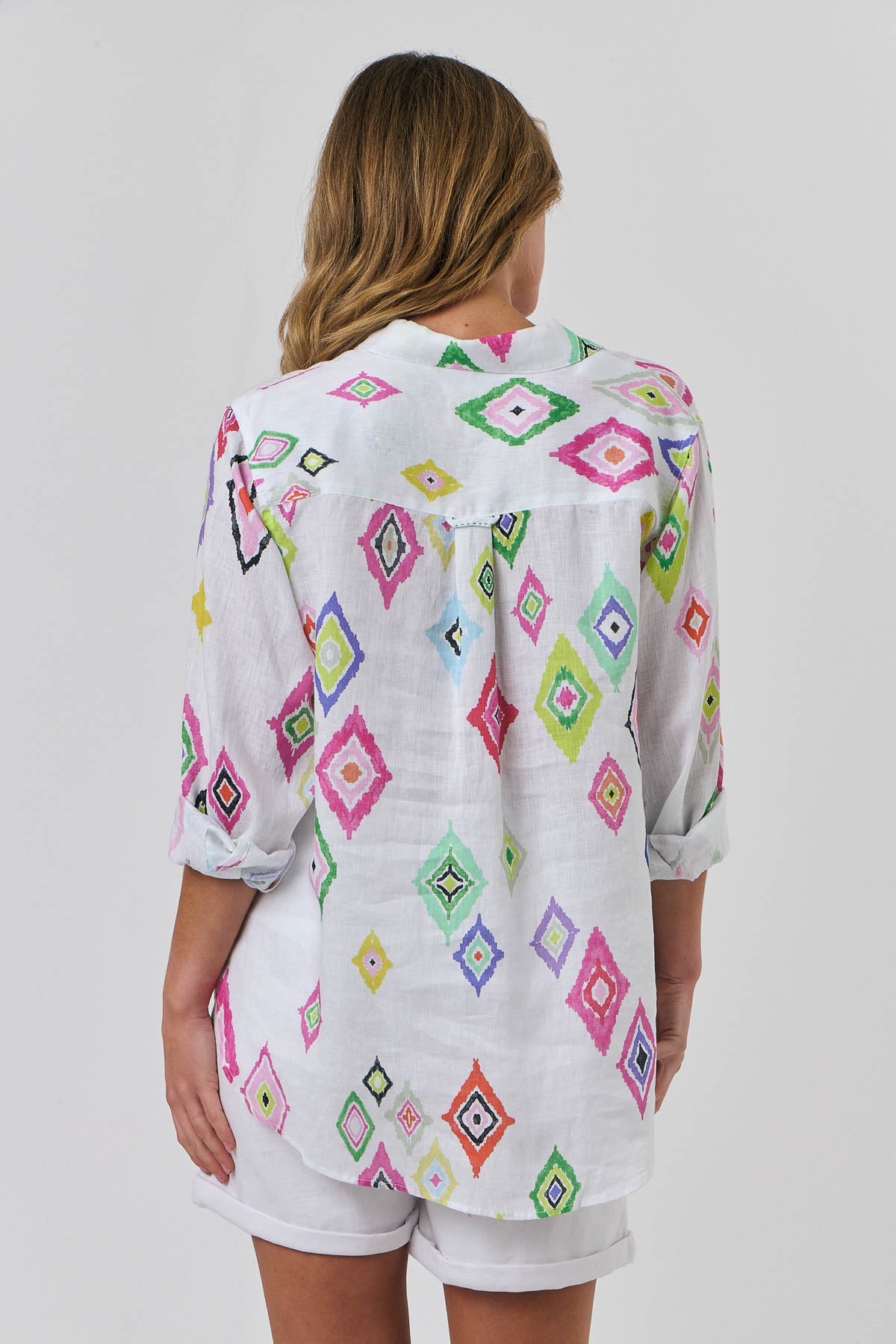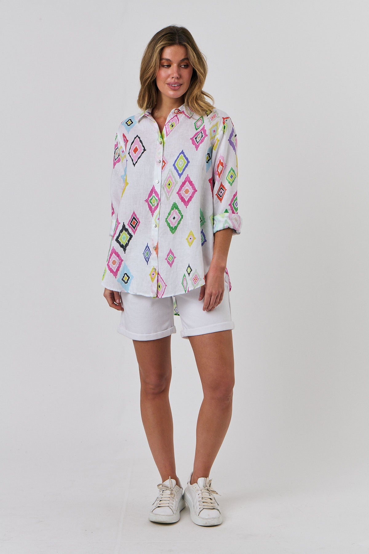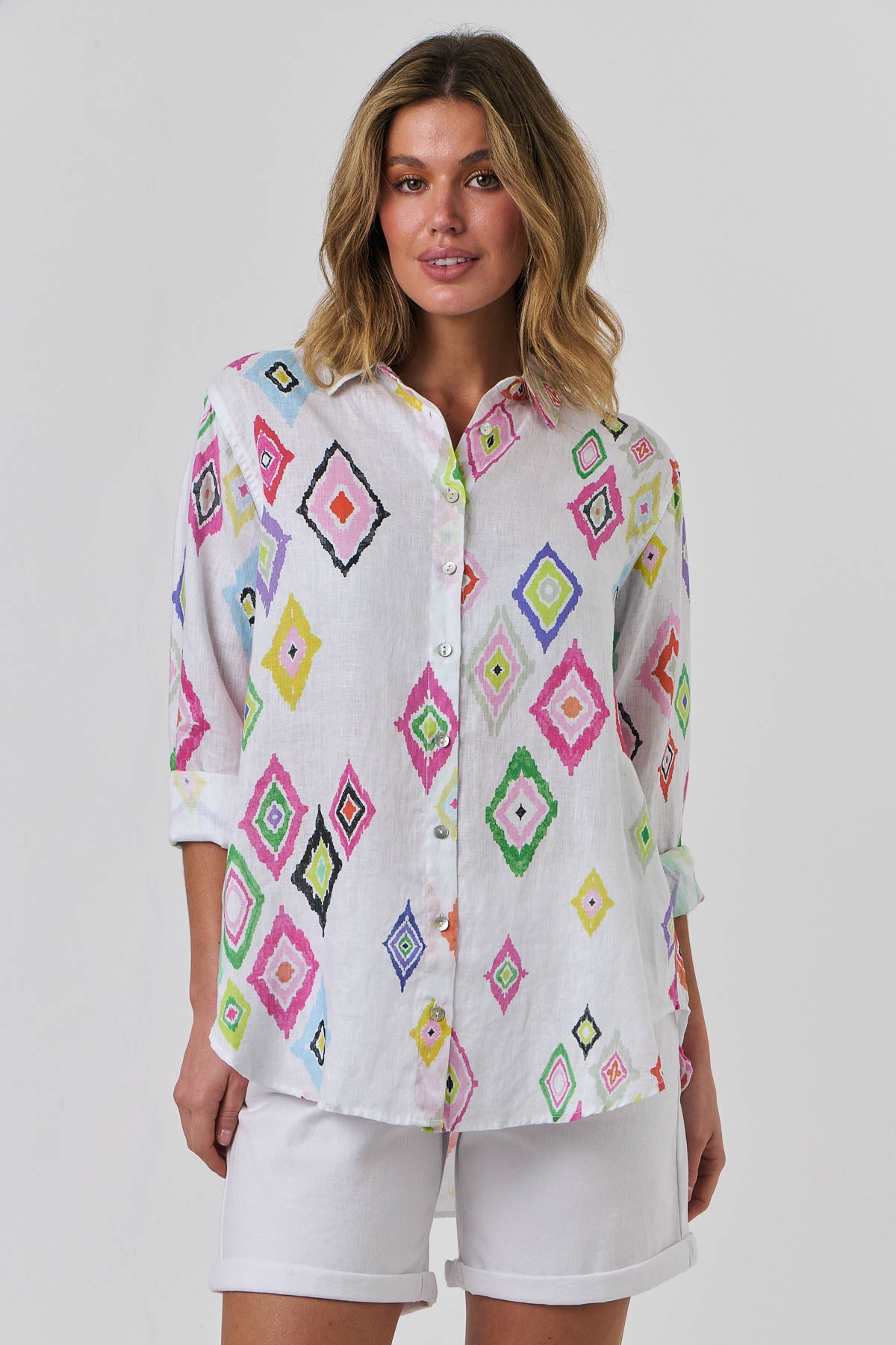 Our signature boyfriend shirt in our bright new print Diamant – so many beautiful colours on a crisp white background. Truly a breath of fresh air for summer. Crafted in super soft, laundered linen with a relaxed shape, long sleeve, button through, and collar. You will notice the signature stitch detail and lush finish offered by this gorgeous label.