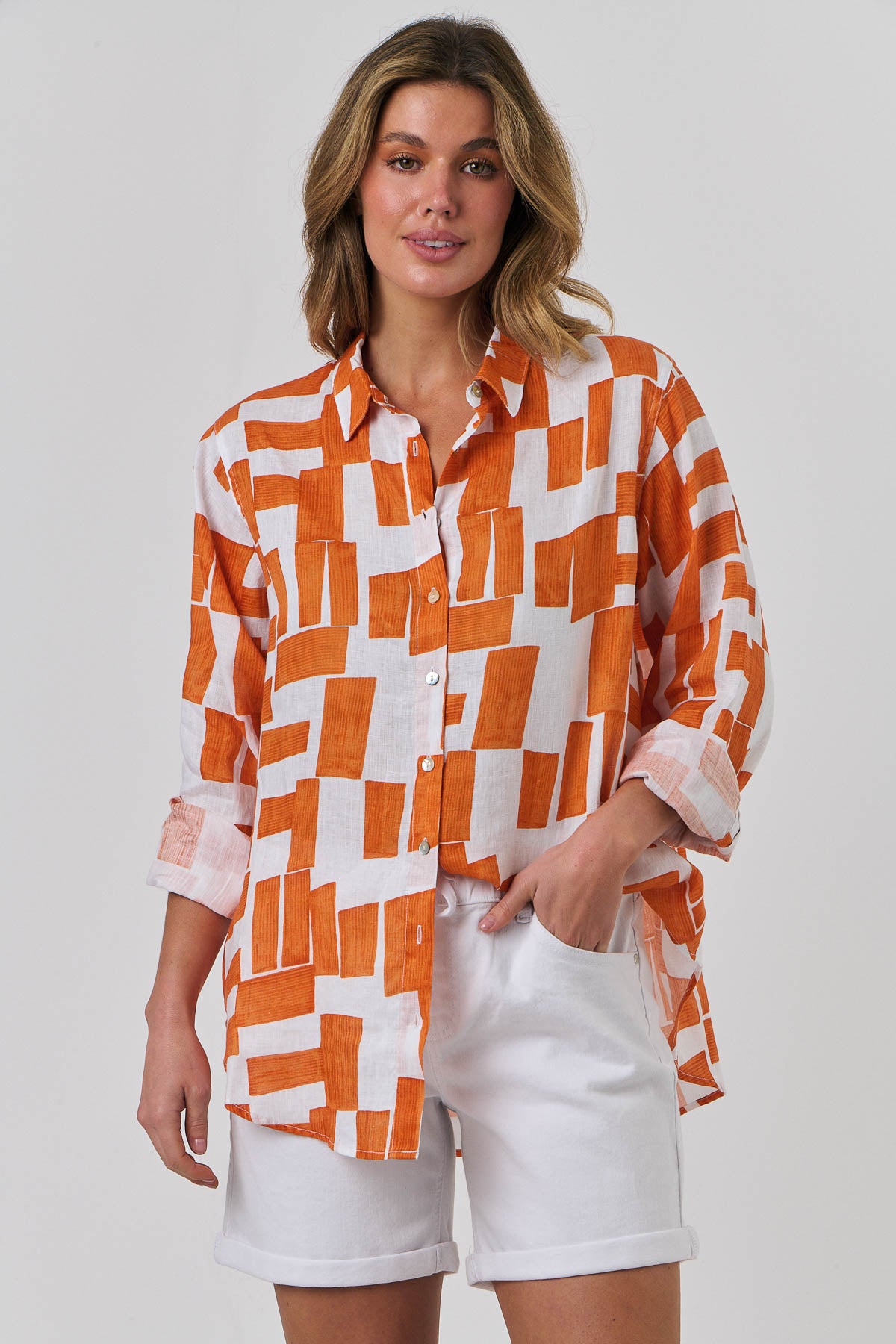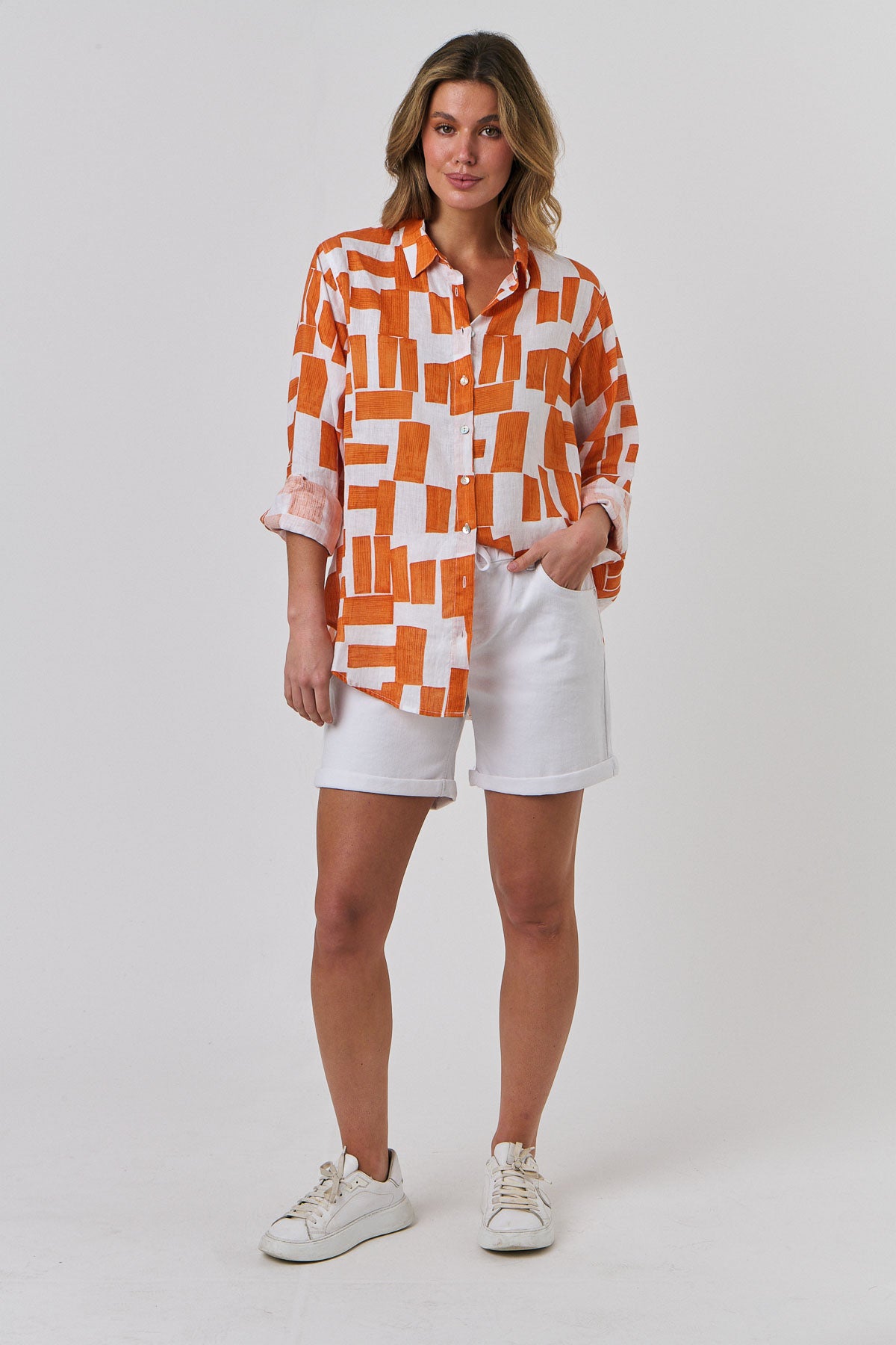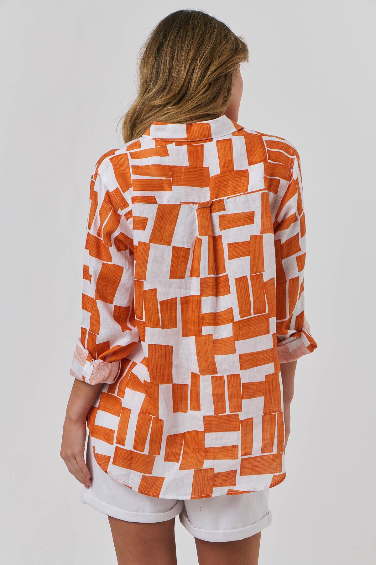 Our signature boyfriend shirt in Pablo Corail. An abstract pattern with a paintbrush effect in the warm glowing colour of a sunset. Crafted in super soft, laundered linen with a relaxed shape, long sleeve, button through, and collar. You will notice the signature stitch detail and lush finish offered by this gorgeous label.