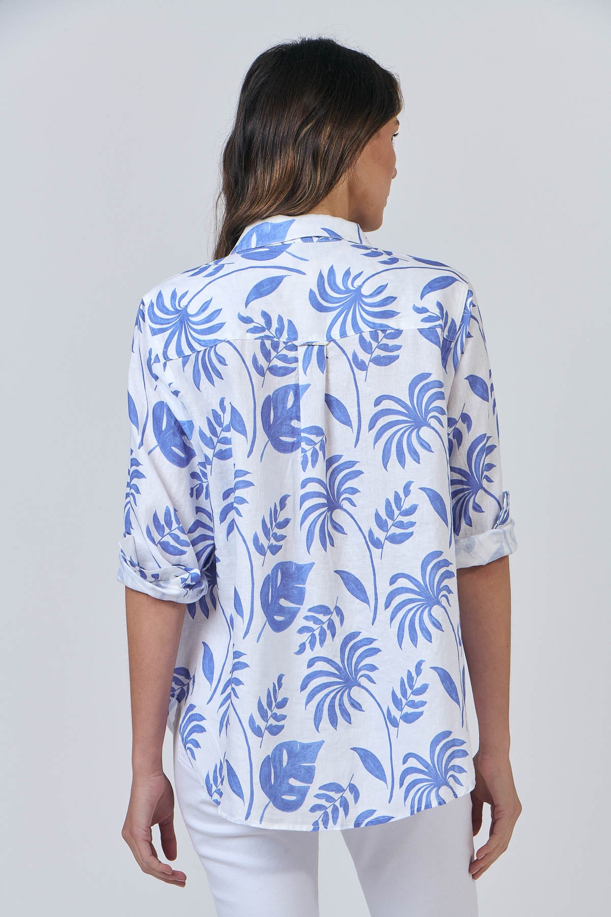 Feuilles print in gradient indigo tones – Mediterranean feel. Our signature boyfriend shirt in fluffy white sourdough has been crafted in super soft laundered linen with a slanted bust pocket and subtle stitch detail. Relaxed shape, long sleeve, button through, and collar. You will notice the signature tack stitch detail and lush finish offered by this gorgeous label.