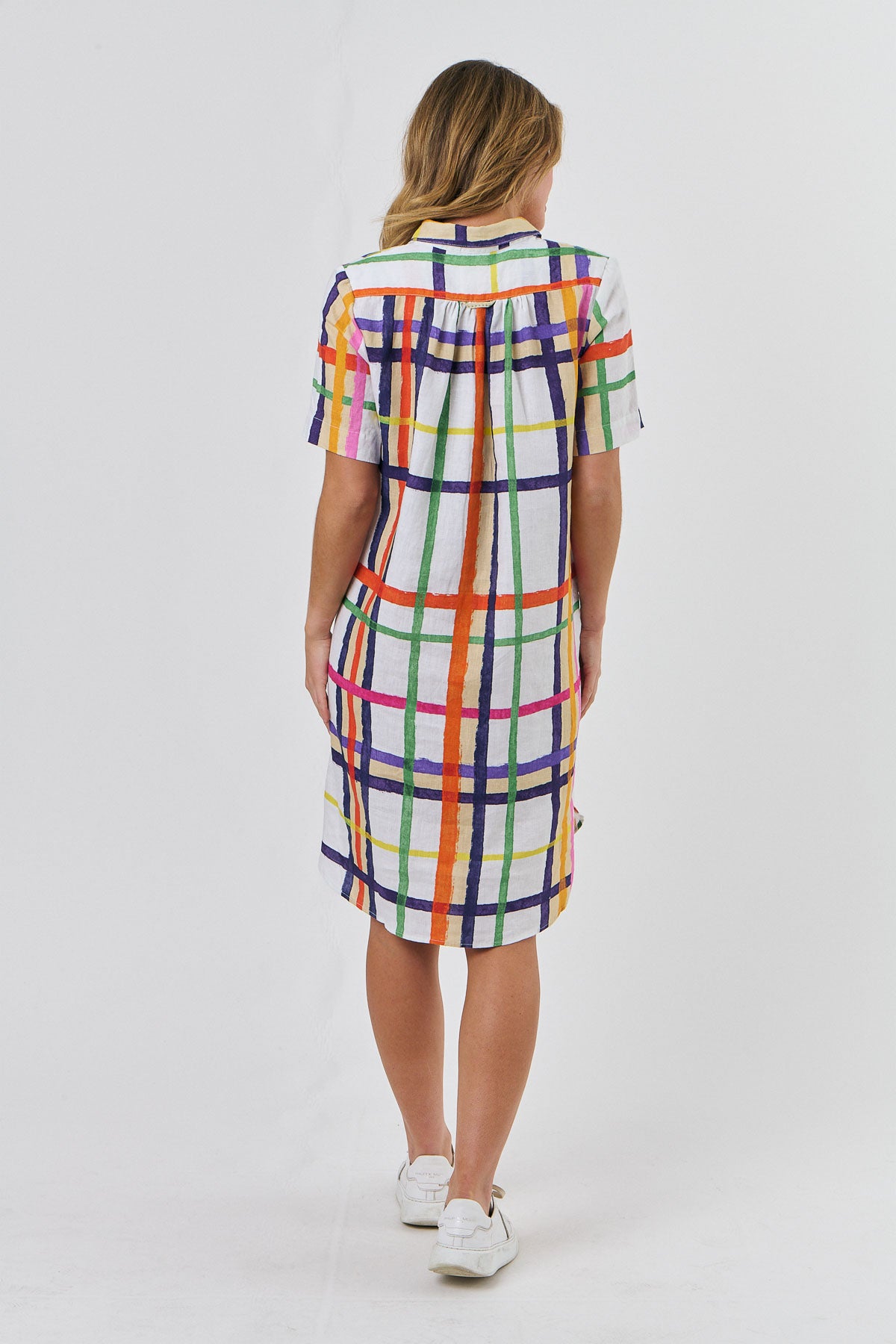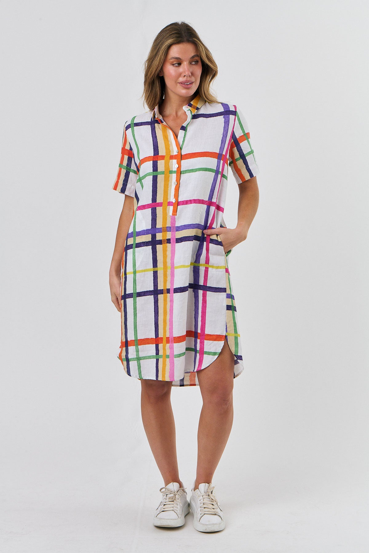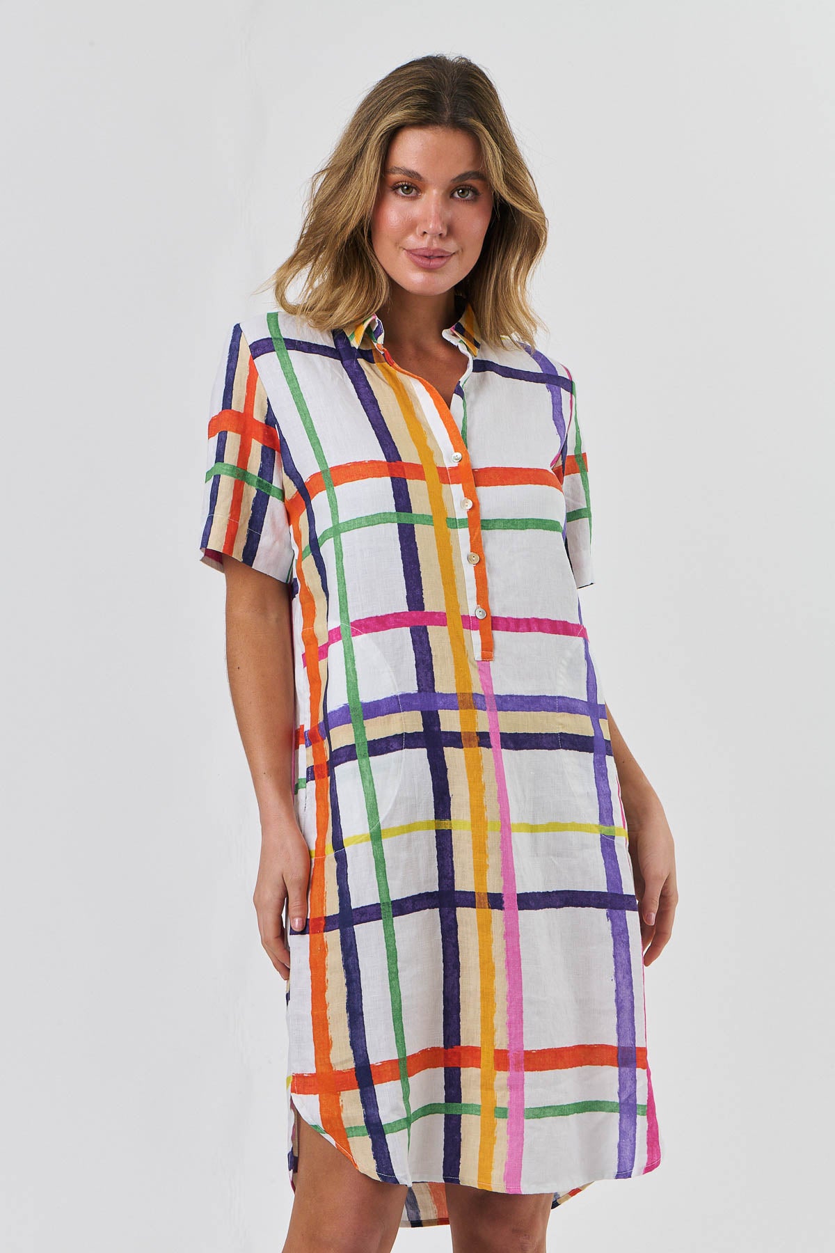 Our signature shirt dress in Eclat – a striking oversized Check in bold colours. Perfect for a cruise in the Mediterranean or a long lunch on Bondi Beach. Our linen shirt dress in this statement check features buttons midway down, short sleeves, and a relaxed collar. Crafted from 100% super soft, laundered linen, with concealed pockets, a box pleat at the back, and a subtle high-low hemline that just grazes the knee.