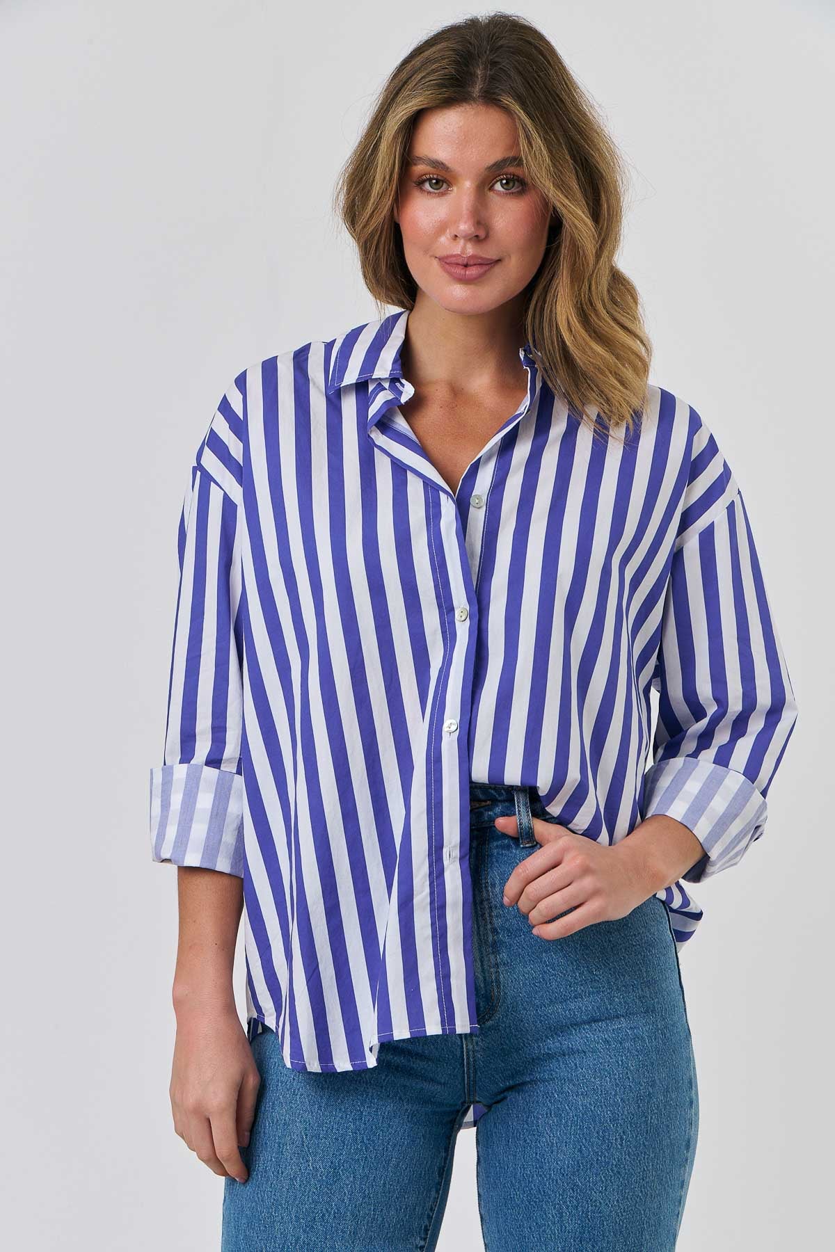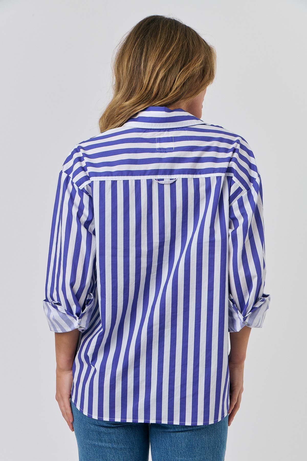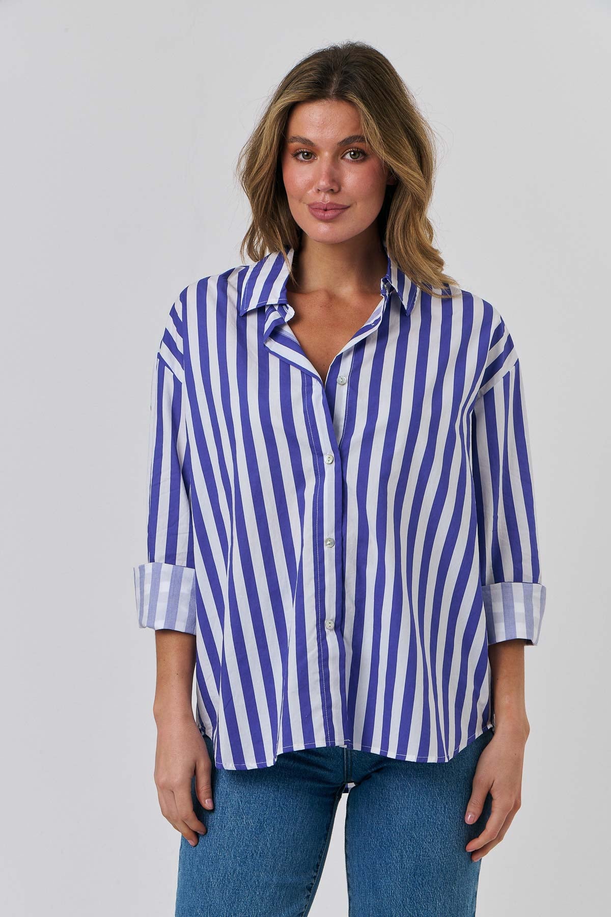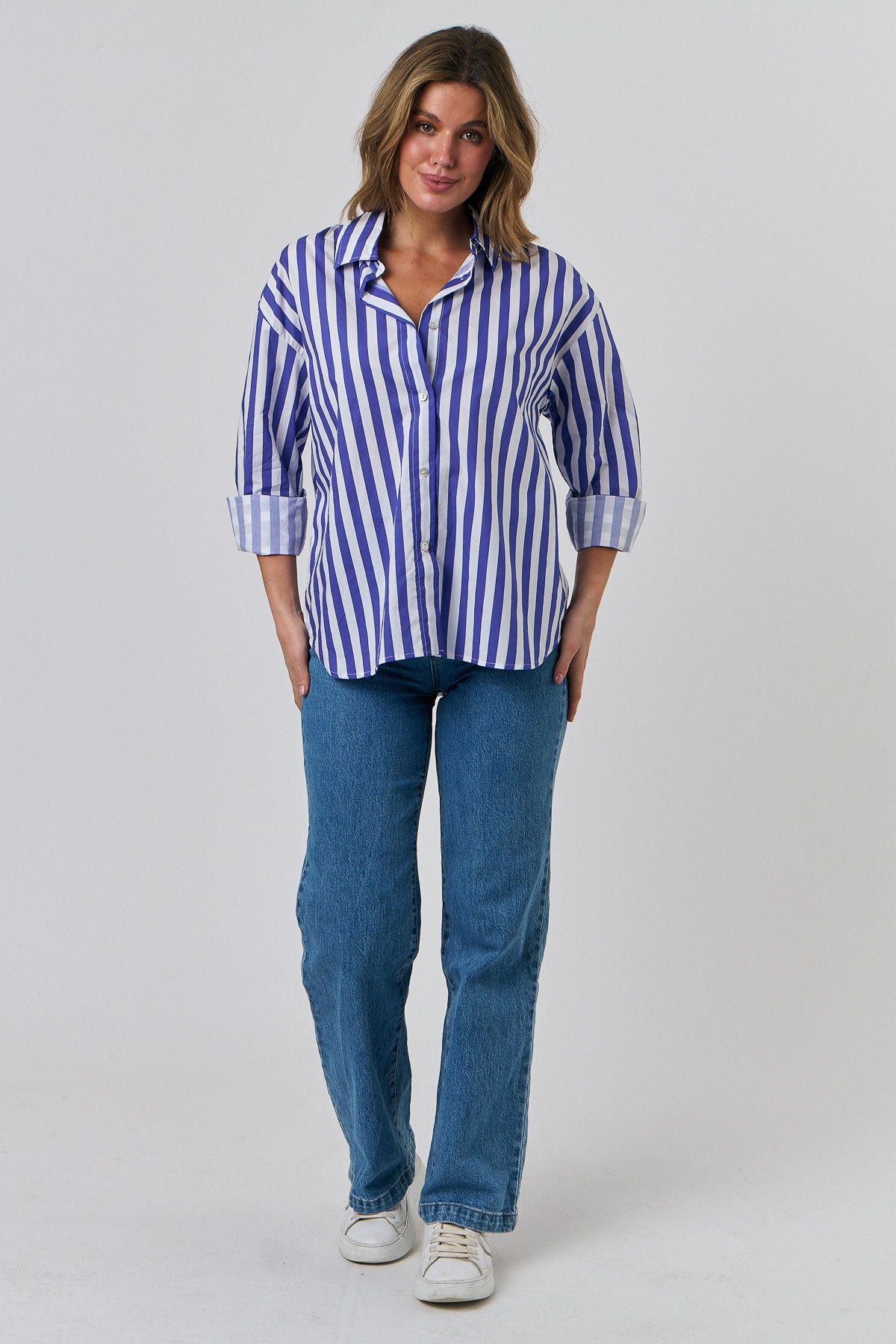 Our new cotton shape, slightly oversized in a lovely crisp poplin. Long sleeves, button through, and collar. A blue and white bold stripe evoking the deep blue sea. You will notice the signature tack stitch detail and lush finish offered by this gorgeous label.