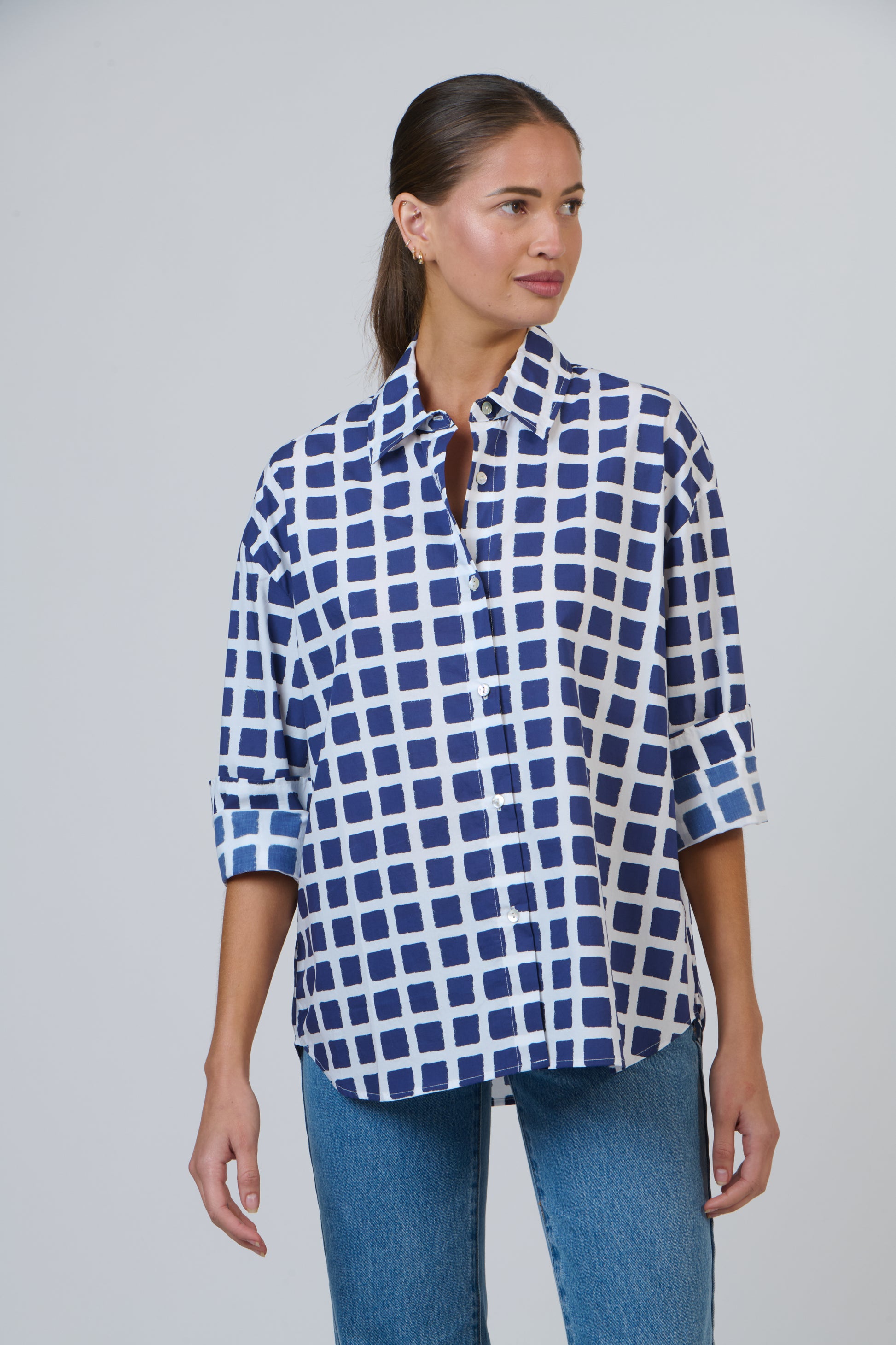 Playful yet polished, our signature boyfriend shirt in ENV/P-132 Impression Azur features a bold hand-painted check print in rich navy and white. Crafted from crisp 100% poplin cotton, it’s cut in a relaxed silhouette with long sleeves, a button-through front, and a structured collar. Finished with the label’s signature stitch detailing, it’s a fresh take on everyday shirting with a graphic edge.