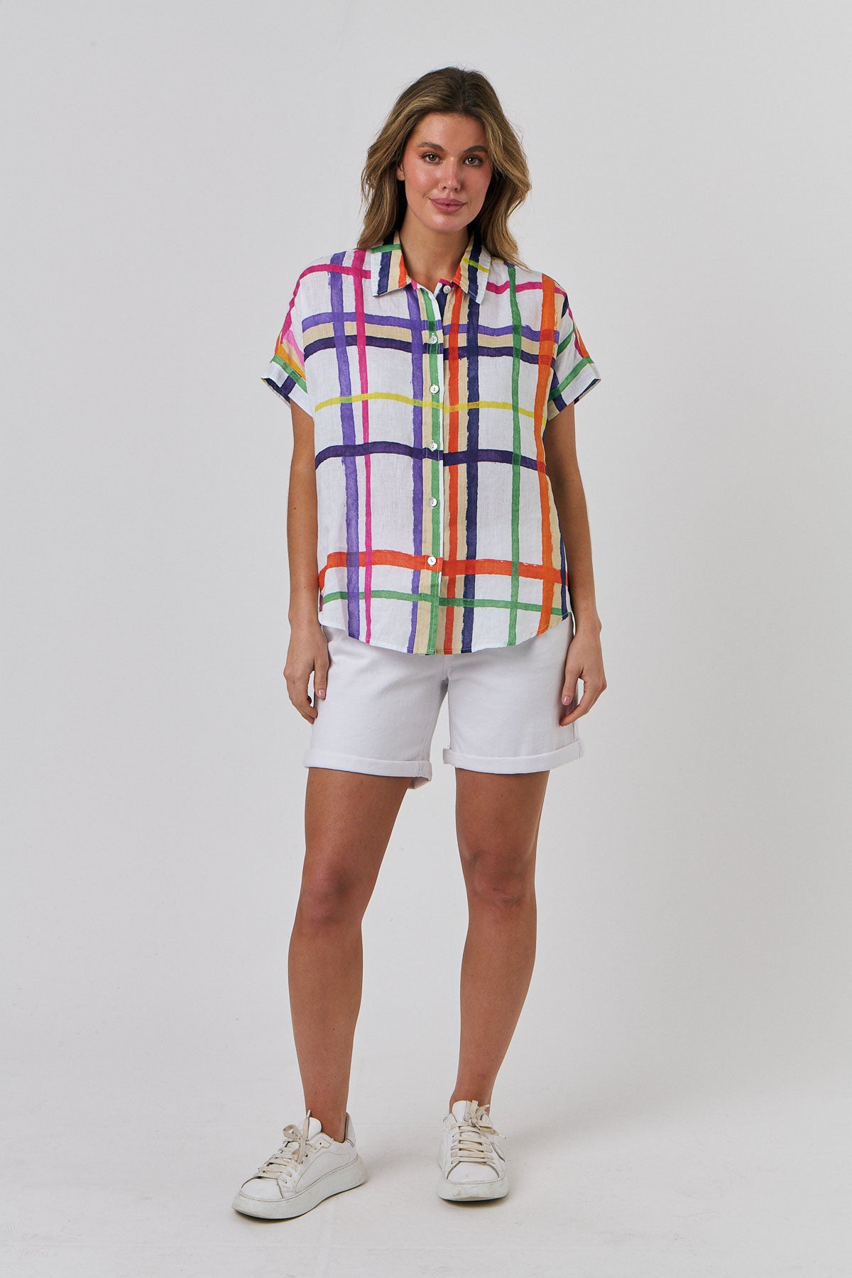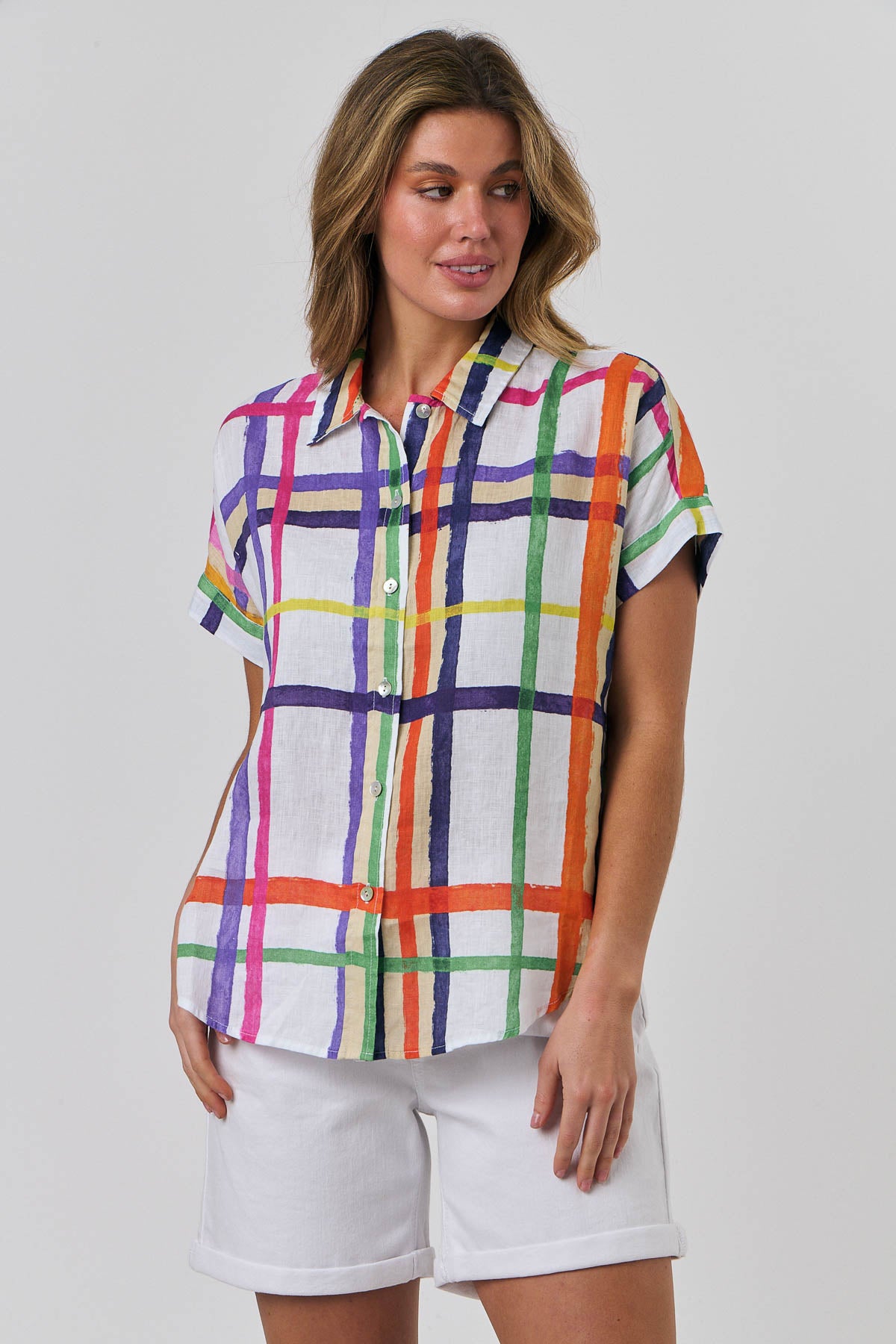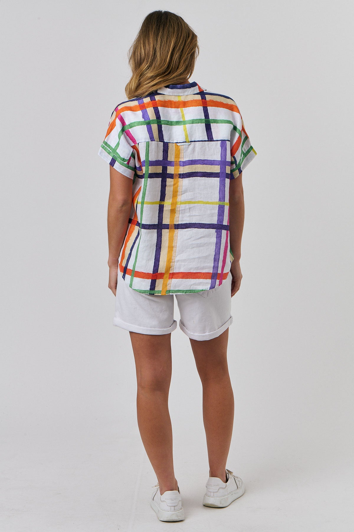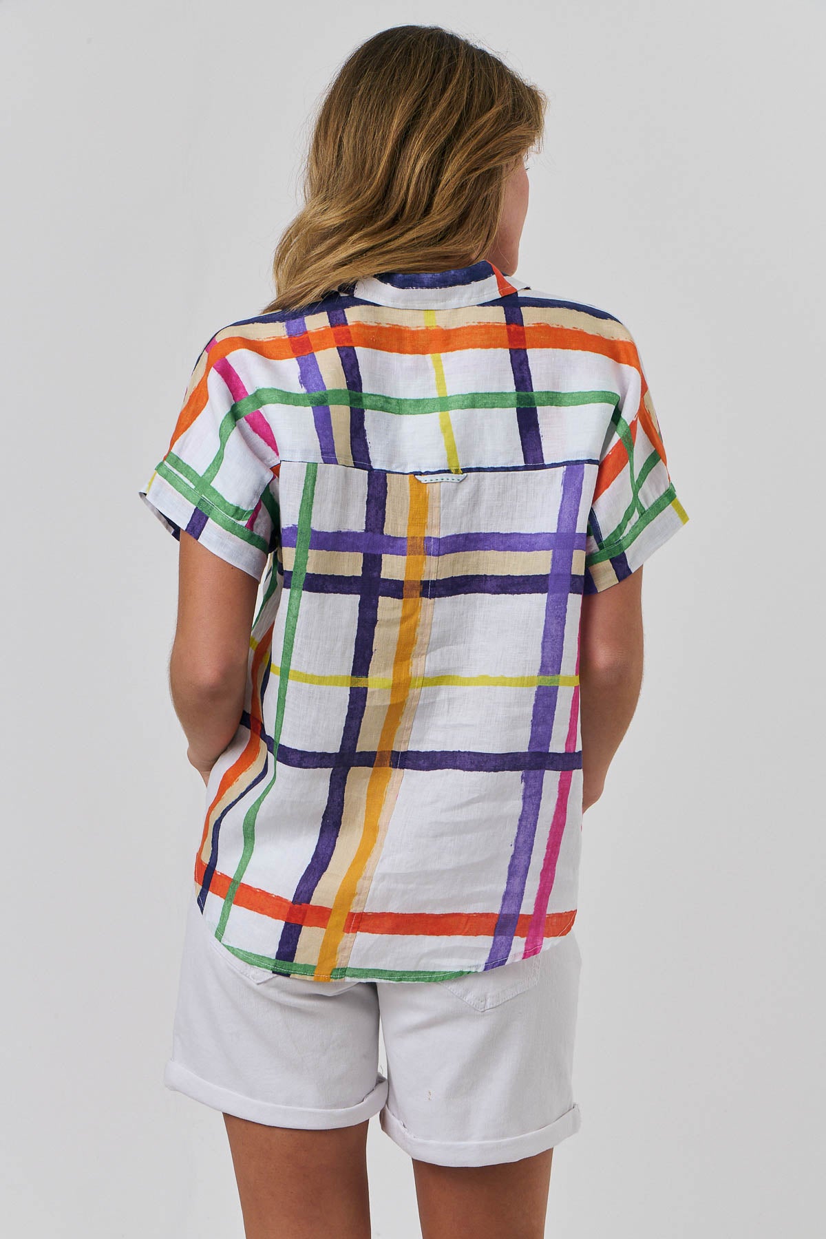 Our signature short-sleeved shirt in Eclat – a striking oversized Check in bold colours. Perfect for a cruise in the Mediterranean or a long lunch on Bondi Beach. The classic short-sleeved shirt in Eclat is crafted from super soft laundered linen. Featuring a relaxed, subtle box design, with buttons all the way down and short, loosely folded raglan sleeves. Made from 100% Linen and designed to be worn tucked or loose.