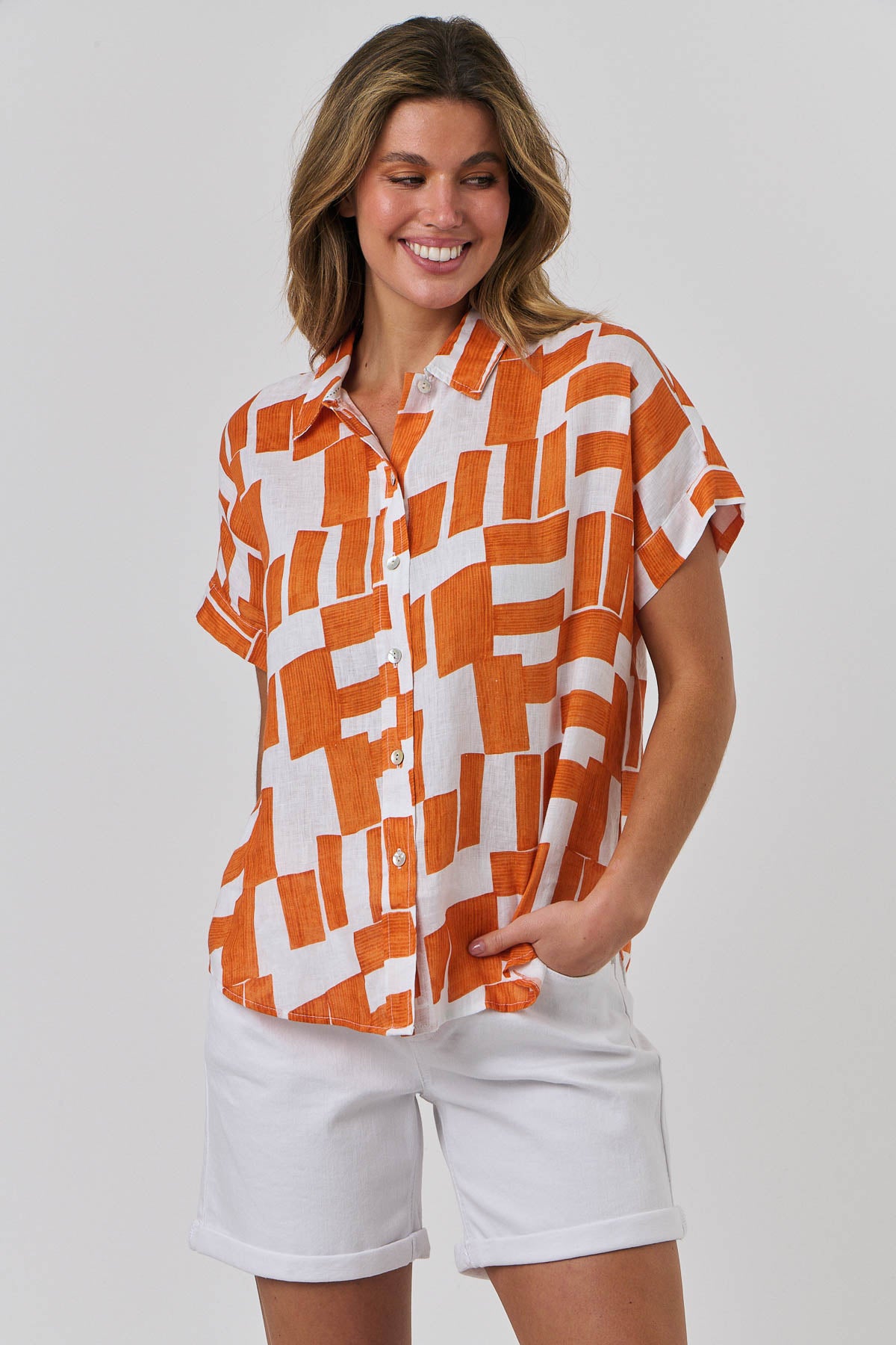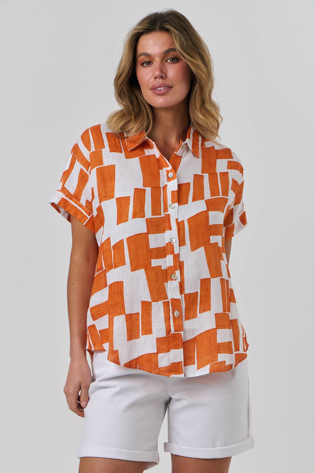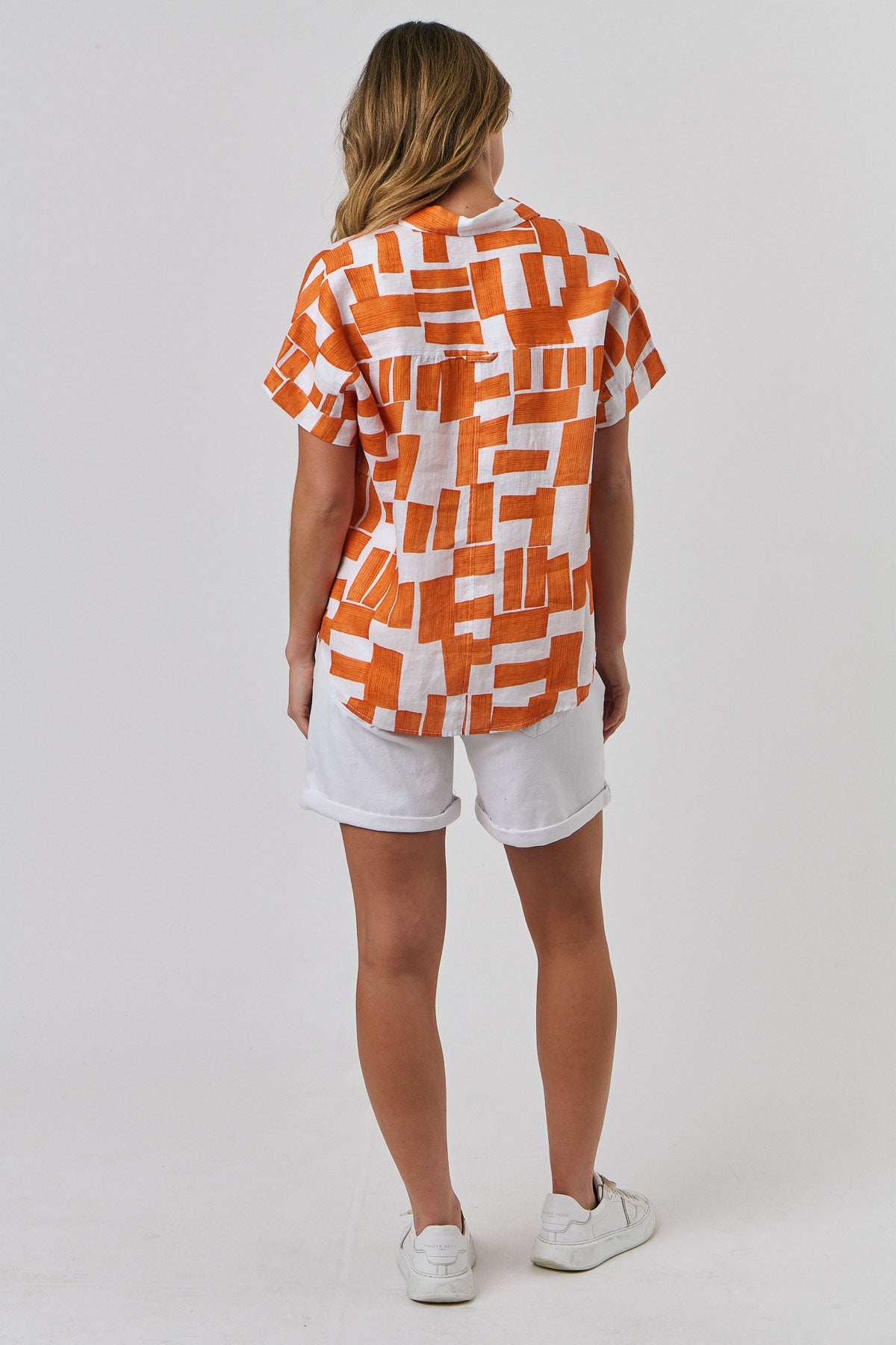 Our signature short-sleeved shirt in Pablo Corail. An abstract pattern with a paintbrush effect in the warm glowing colour of a sunset. The classic short-sleeved shirt in Pablo Corail is crafted from super soft laundered linen. Featuring a relaxed, subtle box design, with buttons all the way down and short, loosely folded raglan sleeves. Made from 100% Linen and designed to be worn tucked or loose.
