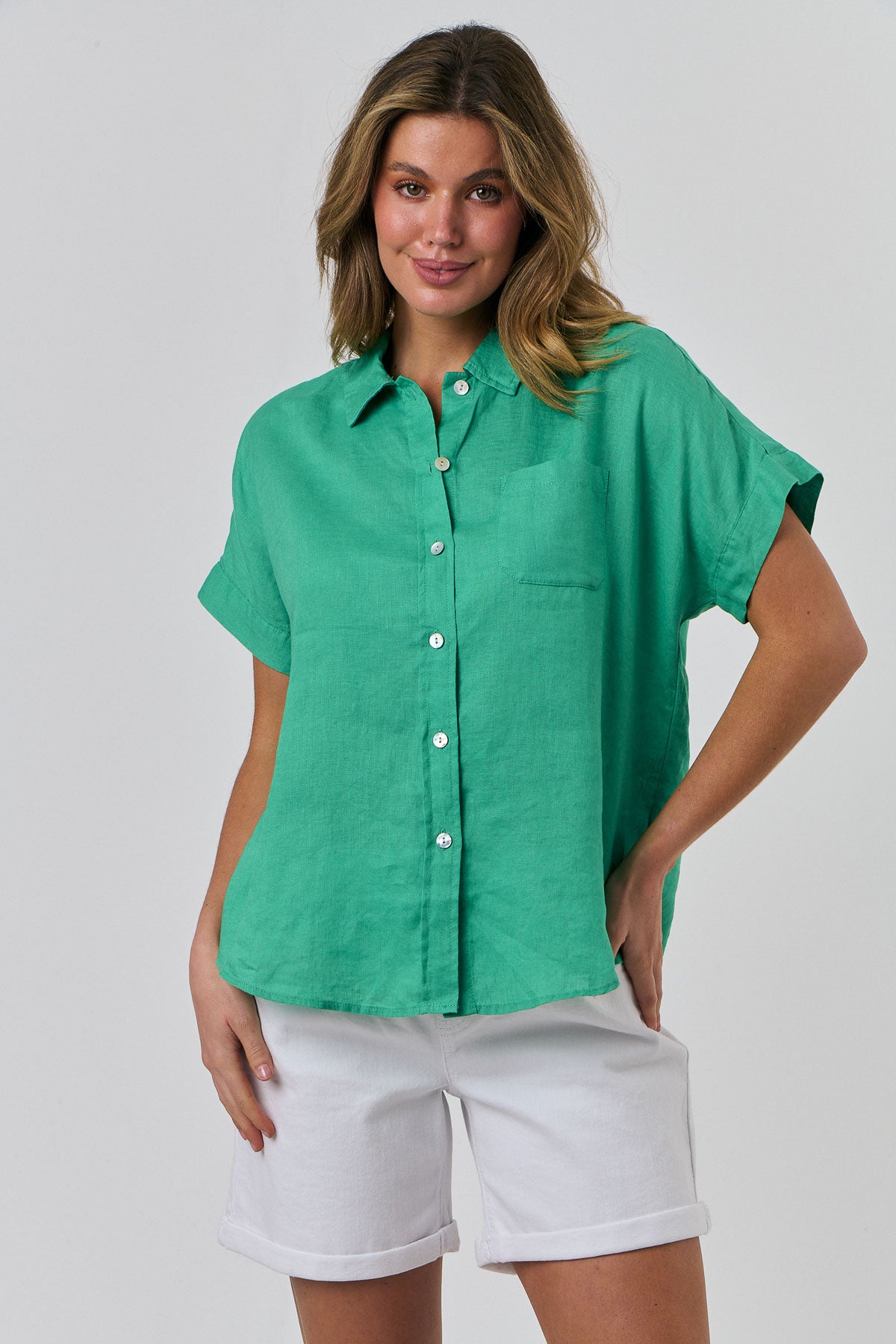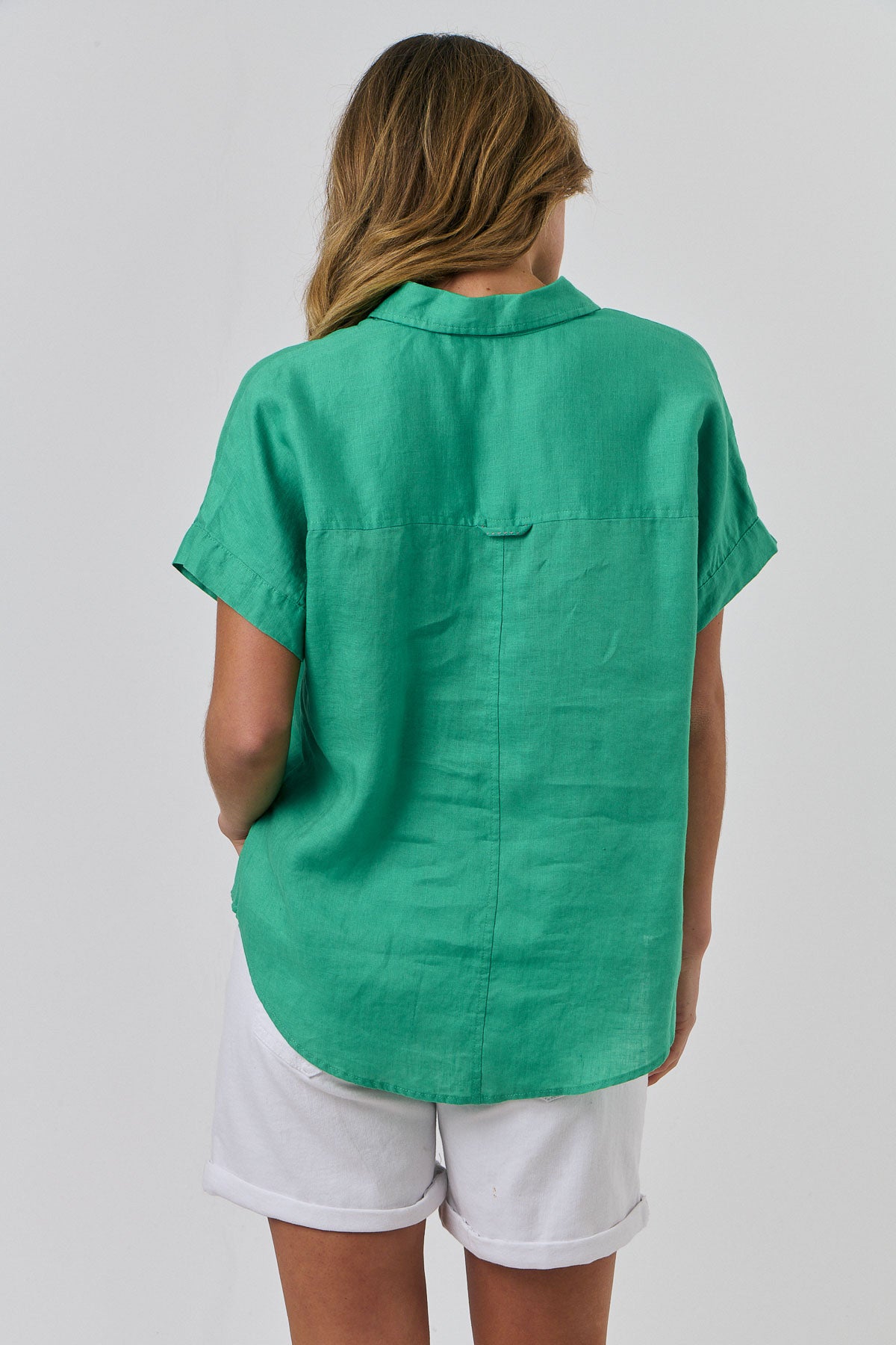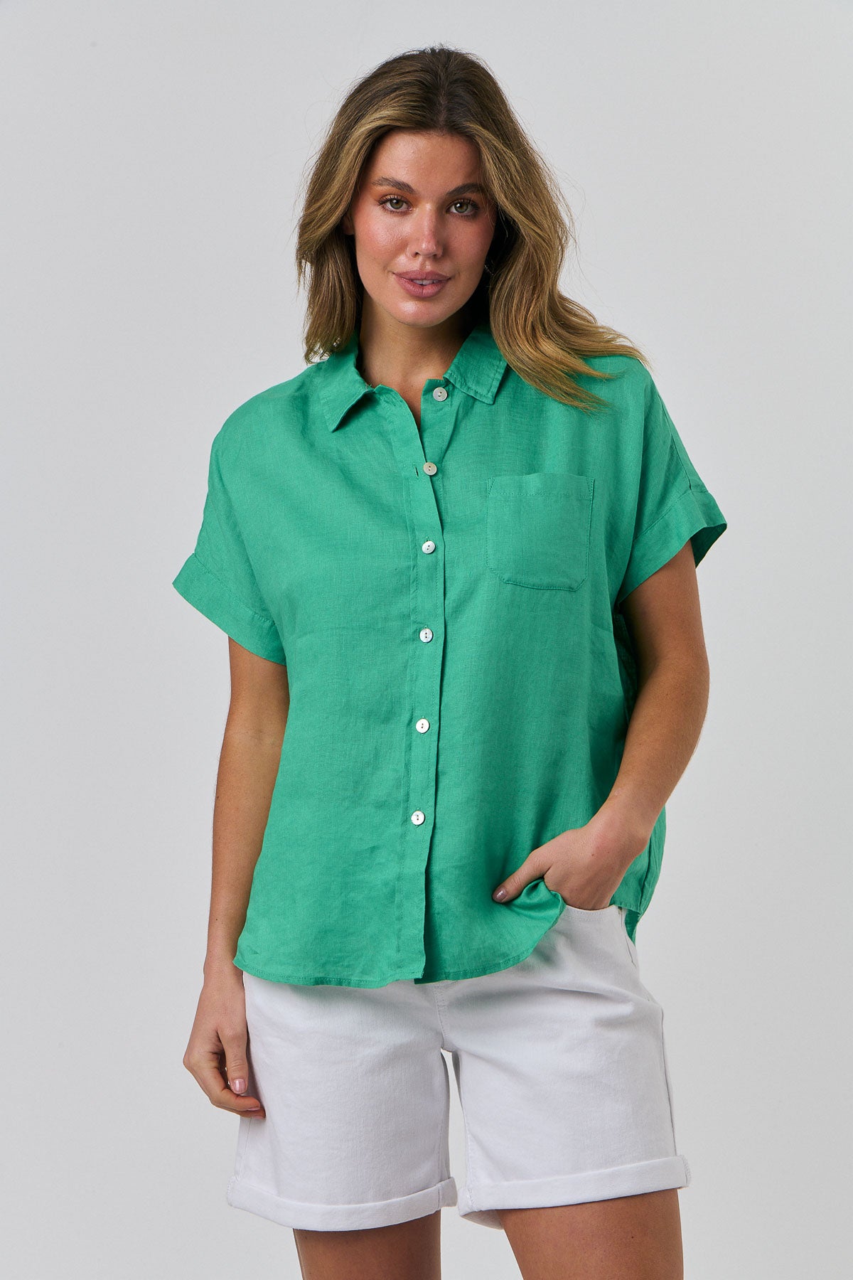 Our signature short-sleeved shirt in a fresh new grass-green. Perfect for a barbeque on a lazy weekend. The classic short-sleeved shirt in Gazon is crafted from super soft laundered linen. Featuring a relaxed, subtle box design, with buttons all the way down and short, loosely folded raglan sleeves. Made from 100% Linen and designed to be worn tucked or loose.